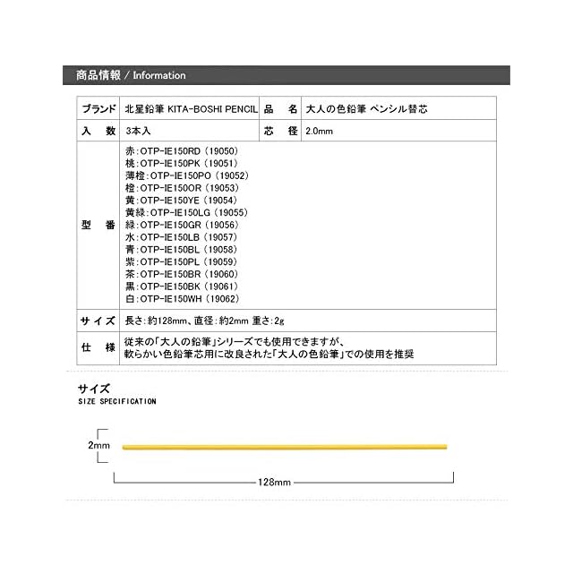 【商品説明】 大人の色鉛筆13の発売に合わせて替え芯も発売致します 国産高級2mm芯、色は赤、桃、薄橙、橙、黄、黄緑、緑、水、青、紫、茶、黒の12色に白を加えて13色になります。 色のりが良く、なめらかで折れにくい、最高の書き心地を味わえます。