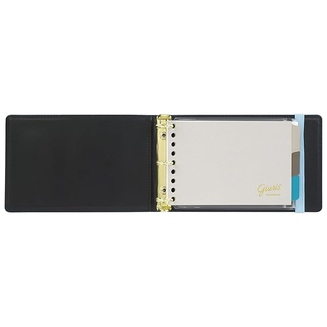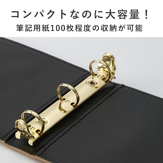 【本文】メモリ入り6mm罫ルーズリーフミニ 10枚、3mm方眼罫ワイドリーフミニ 5枚 【表紙】ポリウレタン、ゴムバンド付き 【穴数】3穴