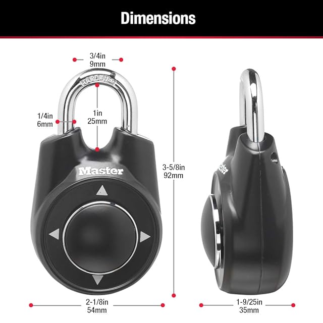 2-1/8インチ。 (54mm)ワイドロックボディ、1/4インチ。 直径6mmのシャックル、1インチ。 長さ25mm、3/4インチ。 幅(19mm)。