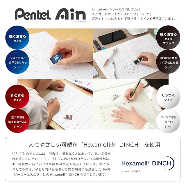 【特長】「軽く消せるタイプ」と「くっつくタイプ」の消しゴムセット