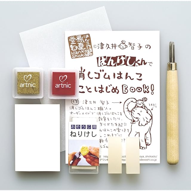 【セット内容】ことはじめBOOK、はんけしくん1/4サイズ(1枚)、彫刻刀 、てん刻(2本)、スタンプ(2個)、お掃除用ねりけし 、トレーシングペーパー