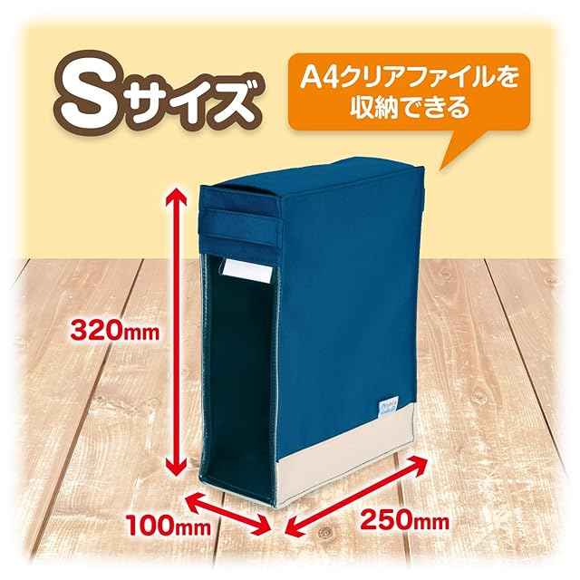 材質:本体/ポリエステル・PVC、底板/PP、インデックス/紙。外形寸法:W250×D100×H320mm。質量:約250g。耐荷重:4㎏。カラーバリエーション:青/茶/赤