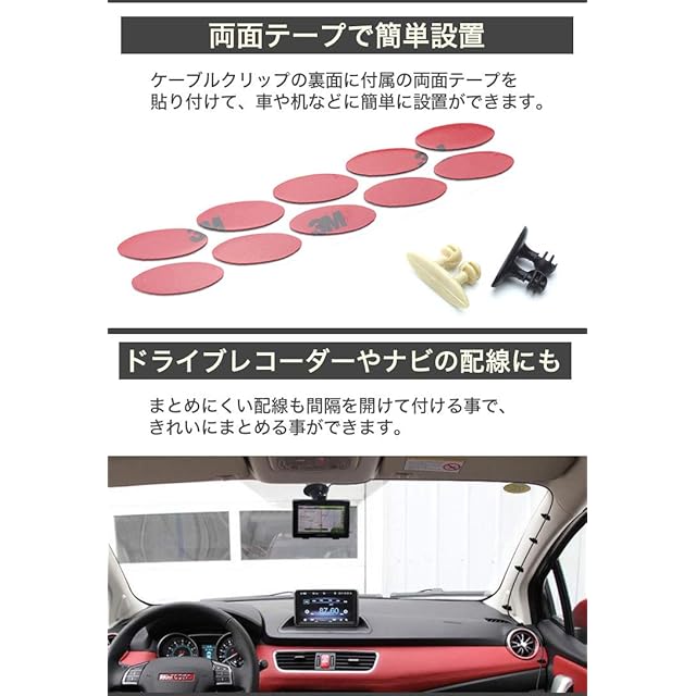 ケーブルクリップの裏面に付属の両面テープを貼り付けて、車や机などに簡単に設置ができます。