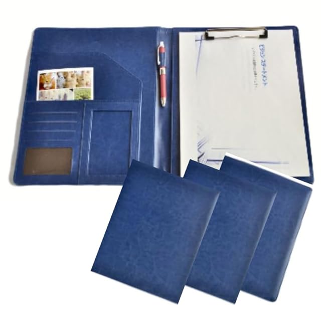 kawauso バインダー a4 a5 クリップボード 二つ折 PUレザー(黒・茶色・紺色・水色) (【3冊セット】紺色(A4))