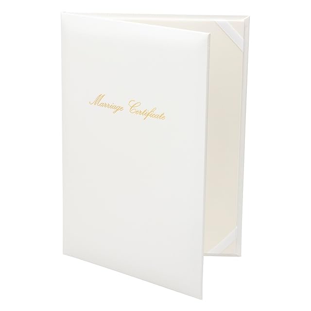 光沢があり皮シボの付いた高級感のある白いビニール生地です。 金文字で「Marriage certificate( 結婚証明書 婚姻届 の意)」と刻印があります。
