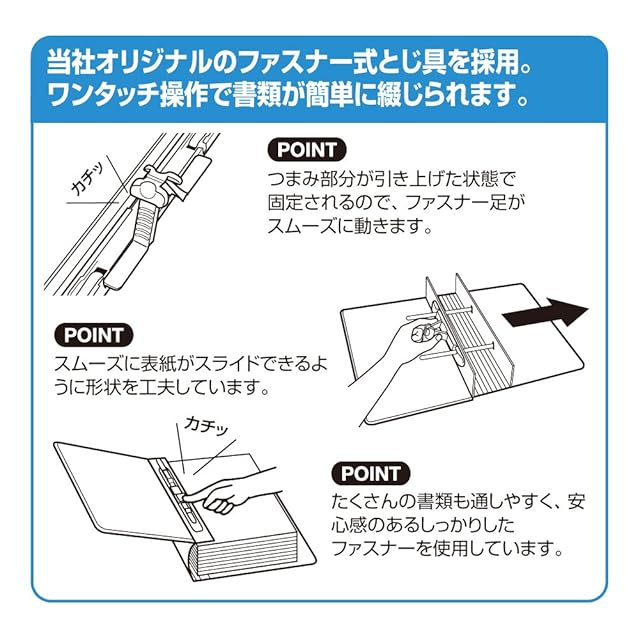 ワンタッチ操作のオリジナルとじ具を採用。簡単操作で書類の抜き差しがはかどります。