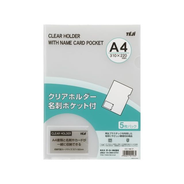 テージー クリアホルダー 「名刺ポケット付き」 (5枚入) A4判 CC-144-17 【5セット】