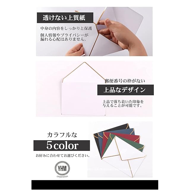 ✅2【 上品なレターセット 】「YHM corporation」製のレターセットは、肉厚な上質紙を使用しているため、中身の内容をしっかりと保護し、個人情報やプライバシーが漏れる心配はありません。また、郵便番号の枠がないため、受取人の方に対して上品で落ち着いた印象を与えることが可能です。色味もカラフルな5色のバリエーションでご用意しておりますのでお好みに合わせてお選びください♪
