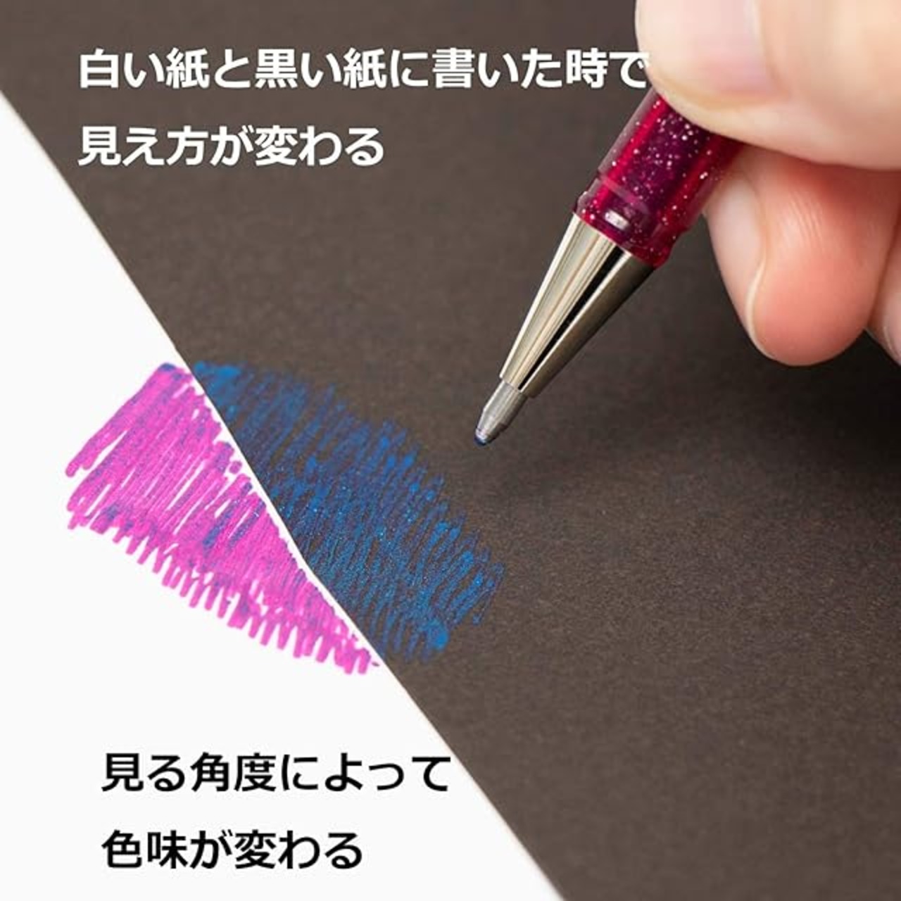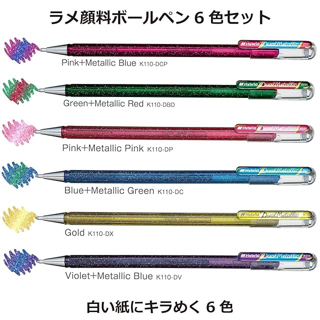 ぺんてる ラメボールペン Dual Metallic K110-6STA 白い紙にキラめく6色セット