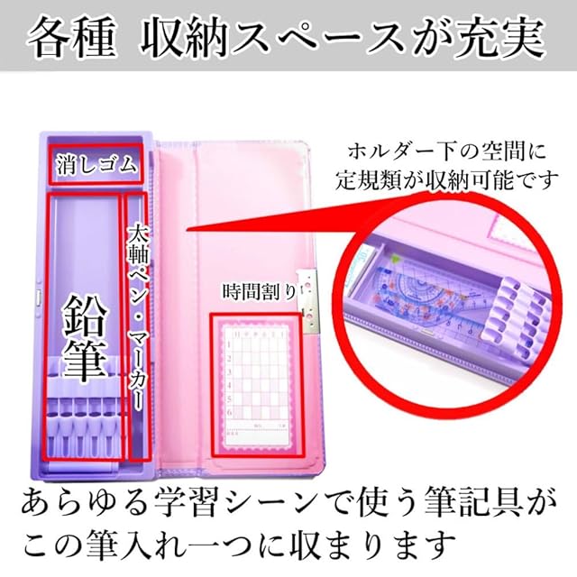 【構造】 鉛筆ホルダー(6本用)、消しゴムスペース、日本製鉛筆削り、定規が入るポケット、三角定規が入る幅広スペース、時間割付き