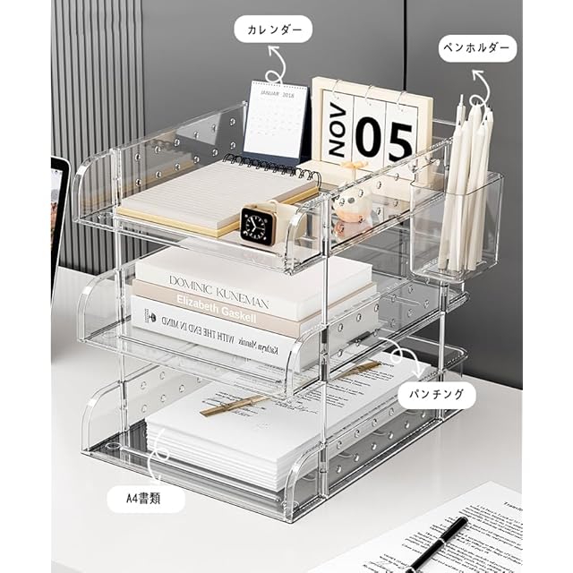 【1個ペンホルダー付き】トレーの両側がパンチングがあります。ペンホルダーがかけてから使えます。ペンや細かい文具、名刺やスマホなどが入れます