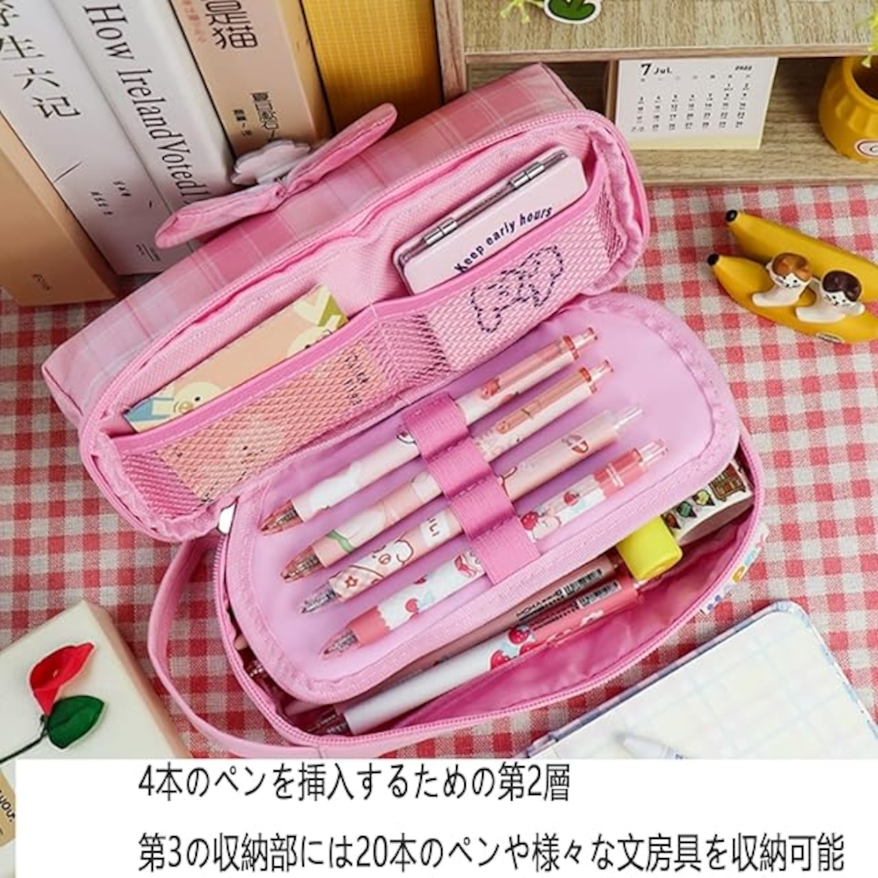 【大容量】: 開けたら口が大きくなりたくさん入るところも、上部開口部のある大容量、下部に多層ポケット、大容量のダブルジッパー、2層のペンケース。大容量でたくさんの文房具を収納することが可能です。収納部は3つに分かれていて整理も楽々♪