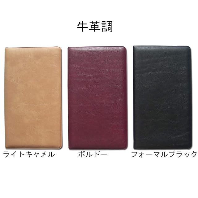 スエード調のキャメル、ベージュ、ワインローズ、ネイビーブルー、サンドブラック、モスグリーンの6色と新色で牛革調のライトキャメル、ボルドー、フォーマルブラックの3色よりお選び頂けます。 銀行ごとに色分けすると便利です。