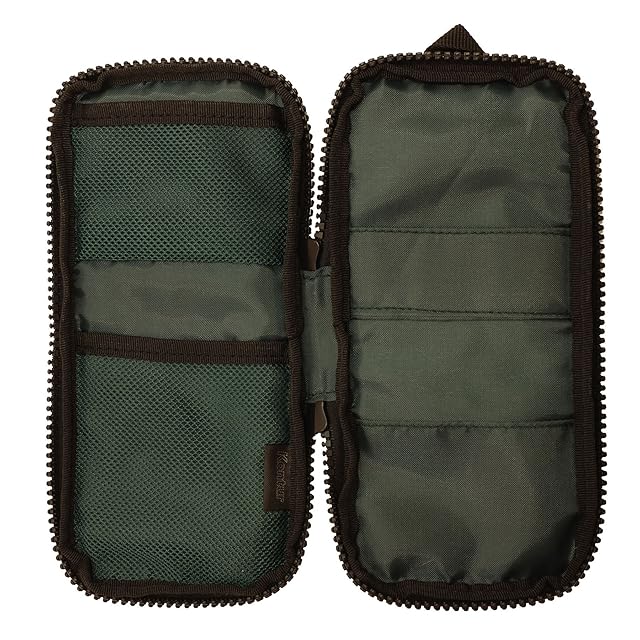 【アウトドアアイテムのような風合いで収納力の高いラウンドペンケース】 さらっとした質感が心地よいラウンドペンケースに、新色として、シャンブレーブルーとシャンブレーグレーの新色が登場しました。ビジネスシーンにも似合う落ち着いたカラーです。 アウトドアアイテムなどに使われるポリエステル素材で、軽くてタフな作りと、収納力の高さが特徴のアイテム。中面にはペンポケットと、大小のメッシュポケット付き。上段は消しゴムや印鑑などの小物、下段は「ロルバーンポケット付メモ縦型 ミニ」がぴったりと入るサイズで、メモや名刺を収納できます。表のポケットはスマートフォンの収納にも便利。ぐるりと囲むファスナー付きで、開いた時に中身が見やすいのもポイントです。