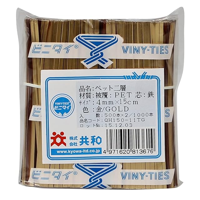 ビニタイ ペット PET 4mm×15cm 金色 (ゴールド) カット品 1,000本/袋 共和 QH150-11TG 針金 ワイヤータイ ラッピングタイ リボンタイ 袋の結束 | HiKaRiストア