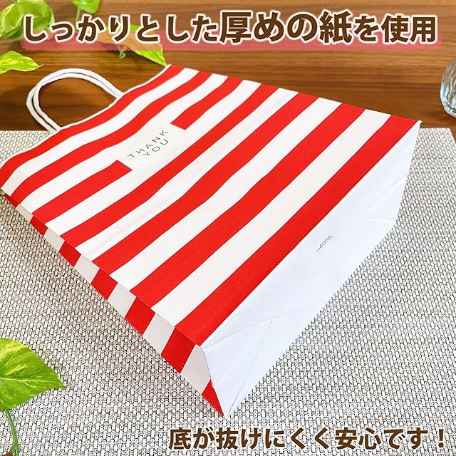 【用途】手作りのお菓子や小物をプレゼントする際の包装におすすめです。 誕生日やクリスマス、ハロウィン、母の日、父の日などの記念日のプレゼントに最適です。 カラーバリエーションも豊かなかわいいデザインの紙袋です。種類はレッド、ピンク、ブルー、ブラックでストライプ柄です。サイズ感もちょうど良いので贈り物を包むのにピッタリなギフトバックです! 大切な思いを届けるプレゼント!オシャレで可愛いラッピングで好感度もアップ!!