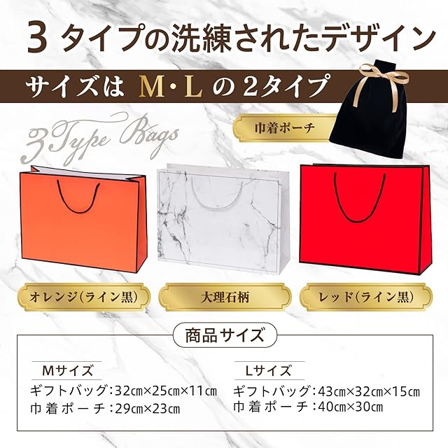 Mサイズ:紙袋 縦25㎝x横32㎝x幅11㎝・巾着袋 縦12㎝x横10㎝x幅8㎝ Lサイズ:紙袋 縦32㎝x横43㎝x幅15㎝・巾着袋 縦20㎝x横15㎝x幅12㎝ のプレゼントを入れる事ができます。