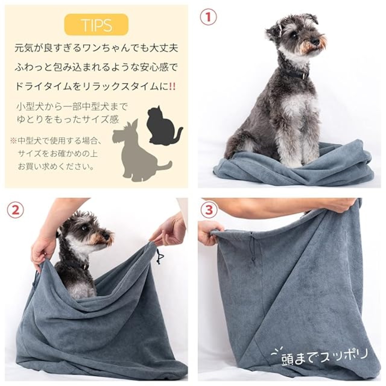 【ドライタイムをリラックスタイムに】 ・超!吸水、速乾のマイクロファイバーが水気をしっかり吸収しドライヤーの時間を短縮。 ・大きく開いて中型犬も元気なワンちゃんもすっぽり優しく包みます。 ・足もとも包み込むのでワンちゃんのストレスも軽減。 ・上部のひもを引いて口を閉じることで水浴び後のブルブルの水しぶきから飼い主さんやお部屋を守ります。 ・お散歩後のシャワーや普段のお風呂、急な雨の日、水遊びなど様々なシーンでご利用ください。