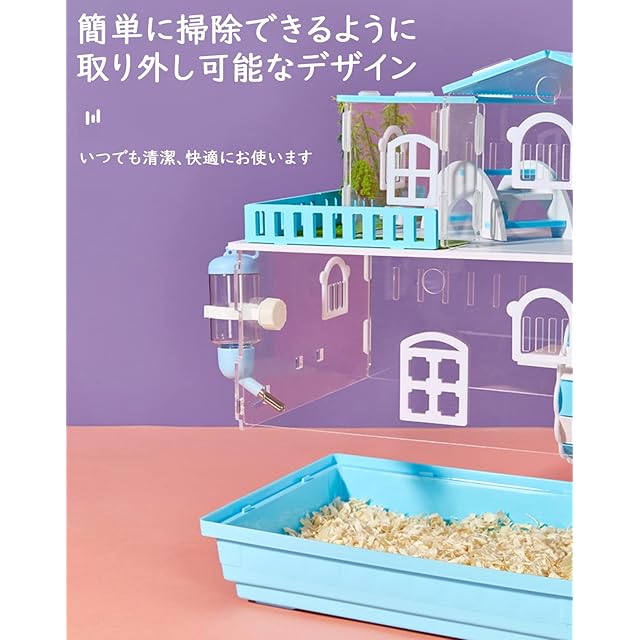 【圧迫感なく&お手入れ便利】どこからでも見やすいように設計されています。ハムちゃんにとっては外がくっきりと見えて、圧迫感がなく、ストレスゼロで住み心地が良いです。透明のケージ体で、小動物の遊び姿ははっきり見えます。ユニークなデザインを採用して、お手入れ時には楽に分離できて、スッキリと洗う事も可能です。通気性は抜群、スペースが広いので、ペットは中で活動しても混雑を感じません。※小動物用底砂・床材が別売り。