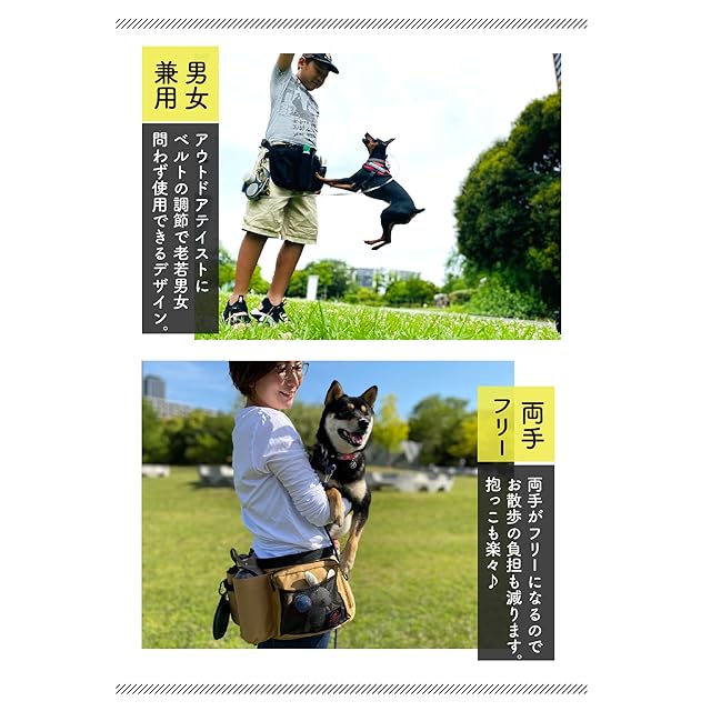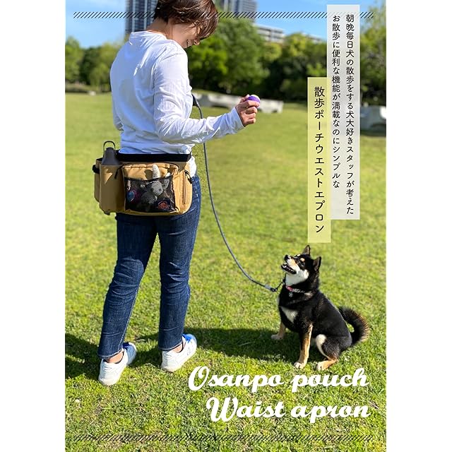 【便利な機能満載でシンプルなデザイン】「お散歩ポーチ(エプロンタイプ)」は、愛犬の散歩に必要な給水ボトル、おもちゃ、マナー袋、タオル、ペットボトル等、たくさんのアイテムを大容量で収納可能なバッグです。男女兼用で調整可能なウエストベルト付きで、快適な散歩をサポートします。