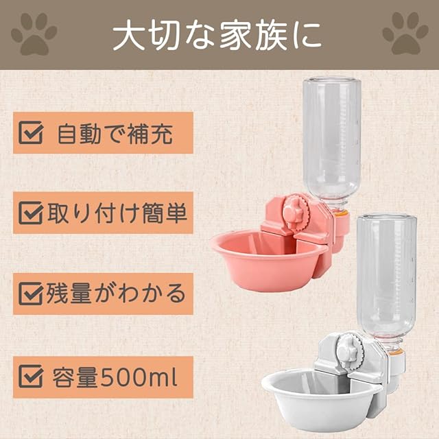 自動で水が補充される自動給水器になります。水が減るとボトルから補充されるので綺麗な水を追加することができ、水の劣化を抑えることができます。ゲージにしっかりと固定でき、容器が床に付く事がありませんので衛生的です。高さが調節可能なのでペットの大きさによって調節ができ、飲みやすくなっております。透明のボトルで残りの餌量がわかりやすくなっております。補充の際はボトルのみを外して手軽に追加でき、長時間のお留守番時も水切れが起きにくくなっております。本体1個、サイズ:縦11.8cm,横17cm,高さ16cm、カラー:ホワイト、容量:500ml
