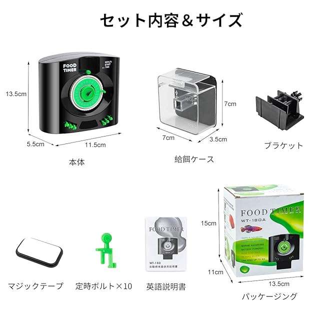 【ご注意】サイズ:13*11.5*5.5cm。商品の寸法は個体により1-5cmの誤差が生じる場合がございます 。予め、ご了承下さい。※自動給餌器は防水ではありません。水槽に取り付ける時に、必ず水面より上になるように取り付けてください。万一の時、水が入ってしまったら、すぐ乾燥してください。丁寧に検品を行い、品質には万全を期しておりますが、万が一初期不慮がありました場合は返金、交換に対応していますので安心してお買い求めください。