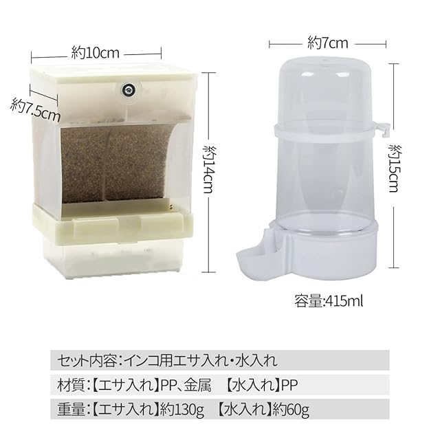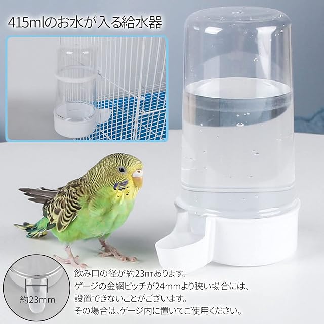 【 自動給水器もセット 】415mlの大容量の水入れもセットです。外付けタイプで、飲み口部分をケージ内に固定する水入れで、場所をとらず、小鳥の快適な空間を保ちます。