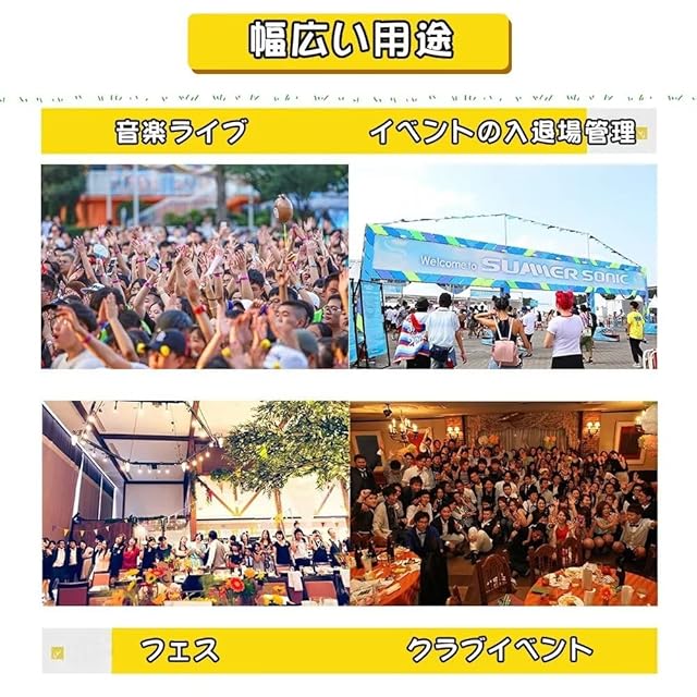 ✅【幅広い用途】イベントの入退場管理、ゲストの属性分けにと、クラブイベントや音楽ライブ、フェスなどのイベント会場で、整理券、チケットバンド、参加証として活躍します。