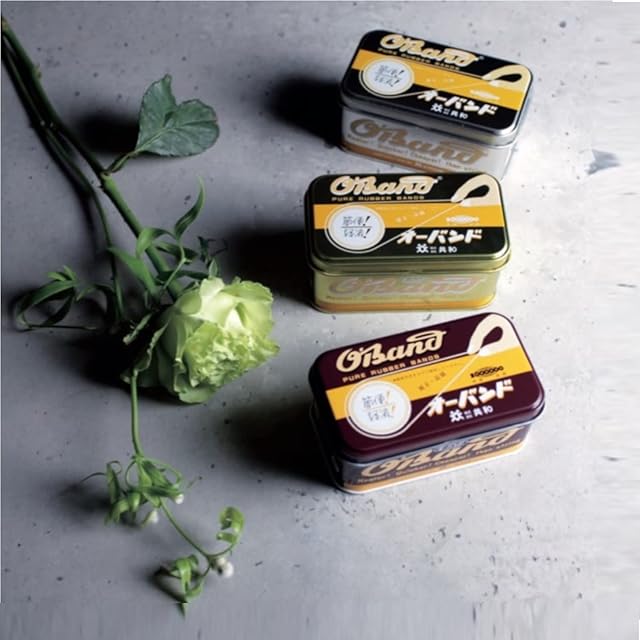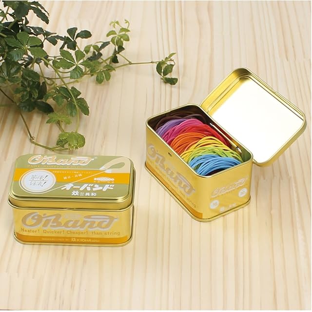 輪ゴムの定番オーバンドの箱デザインが小さな缶になりました。昔ながらのデザインがキラキラとした金色に。ゴージャスな雰囲気がちょっと優雅な気持ちに。