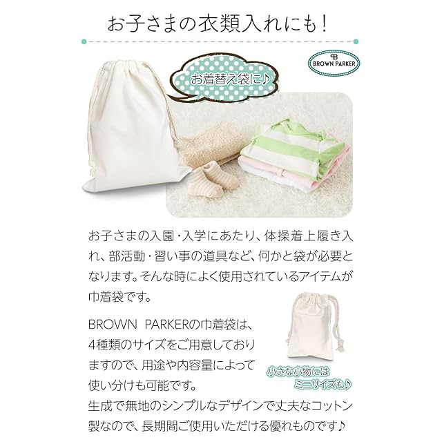【 お子さんの衣類入れにも! 】 お子さんが小学校にあがるにあたり、用意しなくてはならないものもたくさん。その中の1つに体操着袋です。また、部活動や習い事の道具など何かと大変です。体操着入れや道具入れとしてよく使用されているアイテムが巾着袋です。「BROWN PARKER」製の巾着袋は、4種類のサイズか選択可能です。内容量別に使い分けも可能です。シンプルなデザインで丈夫なコットン製なので、長期間ご使用いただける優れものです♪