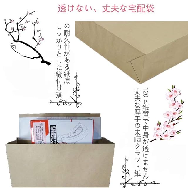 透けない、丈夫な宅配袋: 紙底はしっかりとした糊付け済の耐久性がある角底袋です、丈夫な厚手の未晒クラフト紙120g紙質で中身が透けません。