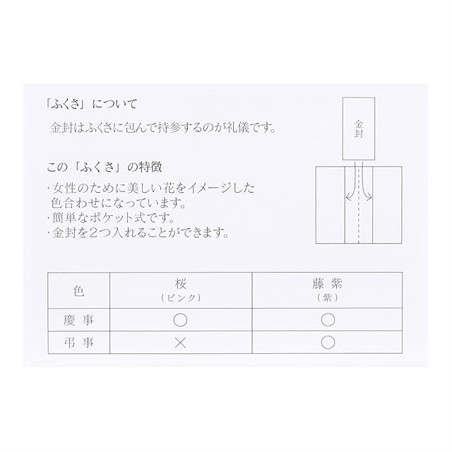 【商品概要】 color:藤紫色: 男女共用 美しい花をイメージした色合わせにした。簡単なポケット式の使いやすいふくさ。慶事・弔事両用