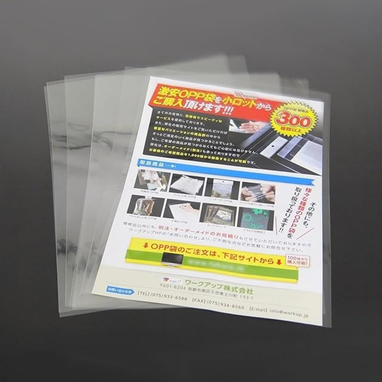 透明封筒、透明袋、フィルム封筒、ビニール封筒、PP封筒とも呼ばれ、DM(ダイレクトメール)やチラシ、パンフレットの陳列にご利用頂いております。