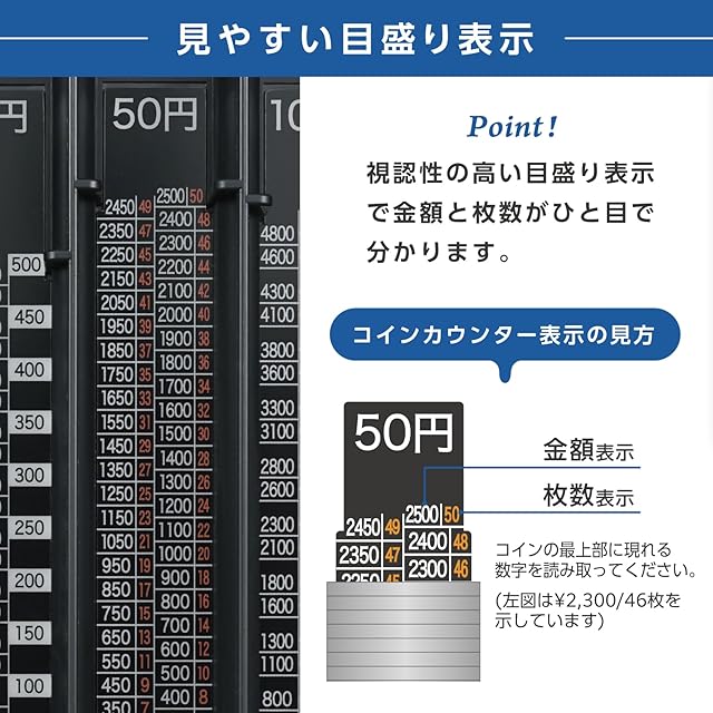 硬貨収納枚数:500円(25枚)・100円(60枚)・50円(30枚)・10円(30枚)・5円/1円(計30枚)