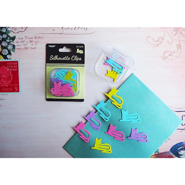 猫のシルエット型のカラフルなクリップです。4色×各3個入りです。紙を挟むだけでは無く、ブックマークや書類のアクセントにも活躍しそうです。 プレゼントにも喜ばれる一品です。 メモ用紙などを4~5枚程度,束ねるのに適しております。