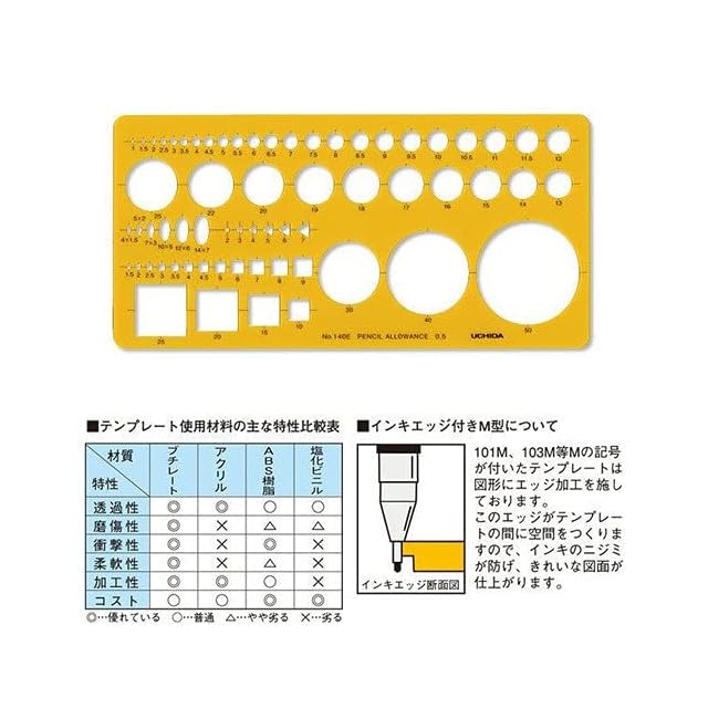 商品説明:これ1枚で図面が描ける。建築士試験対応。課題で要求の多い、10m・8m・6m・5mの内接円を1枚に配置。柱サイズ700角・800角・900角にも対応。※(S=1/200の場合)直径40・50mmの大きな円も描けます。柔軟で割れにくく、透明度も高いブチレートを素材として使用。ブチレートは天然素材(セルロース)を原料としているので、万一焼却しても有毒ガスを発生させません。商品のカラーは図面の文字や線が読みやすく目も疲れにくいオレンジを使用。無駄な反射光が目に入らないよう、片面につや消し加工を施しました。PC制御によるカットで、高精度の品質を達成。