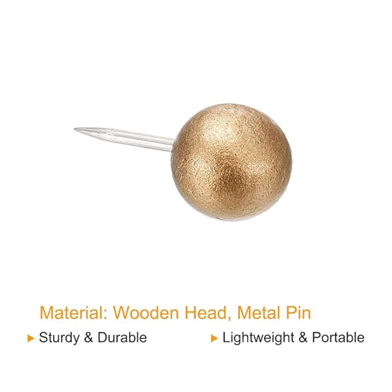 これらの押しピンには複数の機能があり、オフィスの整理、クラフト、アートワーク、マーキング、ホワイトボード、ウォールボード、通知ボード、掲示板、コルクボード、地図、カレンダー、切手、装飾品、ポスター、メモ、写真などに適用されます。<br /><br /><br />仕様:<br /><br />カラー:ゴールド<br />素材:木、メタル<br />ピン長さ:10mm<br />ヘッド径:9mm<br />全体長さ:19mm<br />パッケージコンテンツ:40 x 木製押しピン<br /><br /><br />利点:<br /><br />木とメタル素材で作られて、優れた仕上がり、頑丈で耐久性があり、曲がりや変形が容易ではありません。デスクトップや机の引き出しを整理整頓するのに役立ちます。持ち運びや保管に便利です。<br /><br /><br />使用方法:<br /><br />押しピンは鋭利で挿入しやすく、滑らかで取り外しが簡単です。<br /><br /><br />注意:<br /><br />コンクリート壁には釘を打たないでください。