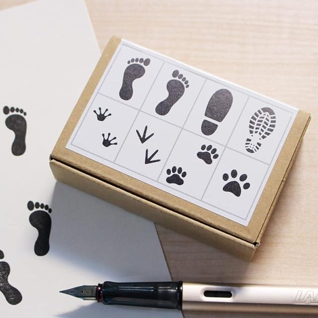 ペタペタといろいろな足跡のかわいいスタンプ。8個セット。 スクラップブックなどに使っても楽しいデザイン。 無地の付箋などにワンポイントで押してもかわいいです!今までのスタンプにないような、おしゃれなデザインと手頃な価格が魅力です! 素材には天然ゴムとスタンプの台木には廃材や木くずなどを使用し環境に配慮しています。 シンプルな使い心地です。全て日本製で1つ1つ手作りで制作しております。 シンプルでかわいいパッケージ。プレゼントにもどうぞ。
