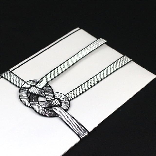 蓮葉なしタイプで宗教問わず使えます。総銀水引の両端に黒色の水引を使用した10本あわじ結びの水引飾り。