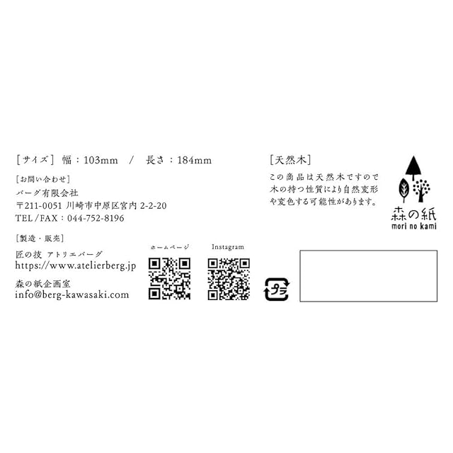 素材:ひのき、裏面:和紙、サイズ:103×185㎜、厚さ:㎜