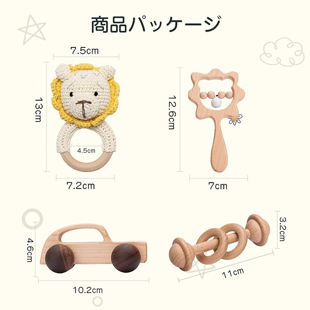 【安全な天然木】木の優しい素材感と可愛らしいフォルムの木のおもちゃの、オリジナルギフトセットです。天然木を使って、職人さんが一つ一つ手作りした安心安全な木のおもちゃのセットです。ベビーセットの木のおもちゃは、優しいデザインで赤ちゃんが舐めたり握ったりすぐに楽しめます。無塗装で温かみある手触りに大人も癒されます。