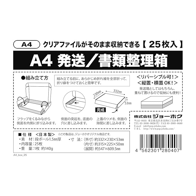 ◎ジョーホクオリジナル段ボール製品 ◎両面(白/茶)どちらも使えるリバーシブル仕様 ◎A4クリアファイルが収納できる便利なサイズ ◎発送箱や収納箱に最適!