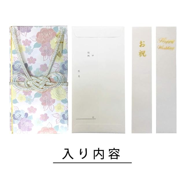 【セット内容】金封(外包) 1枚、内包用封筒(住所、氏名、金額欄印刷あり) 1枚、短冊 2枚(Happy Wedding、お祝)