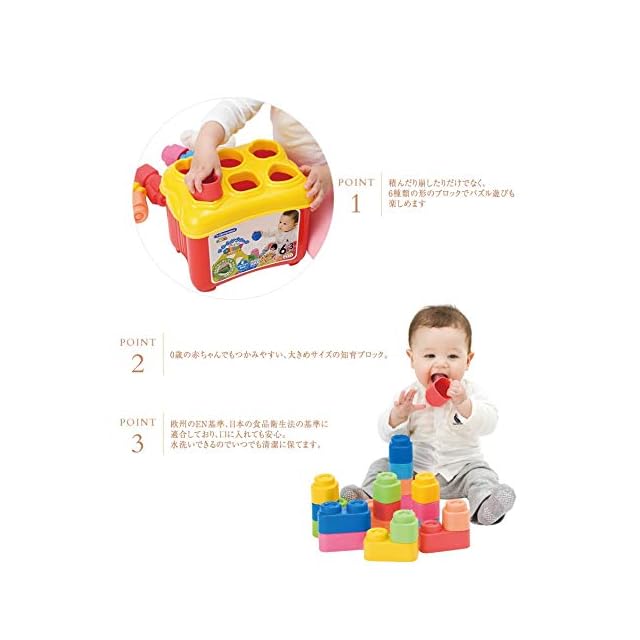 やわらか素材で赤ちゃんの初めてのブロックにおすすめの知育ブロック。パズル遊びもできるボックス付き。