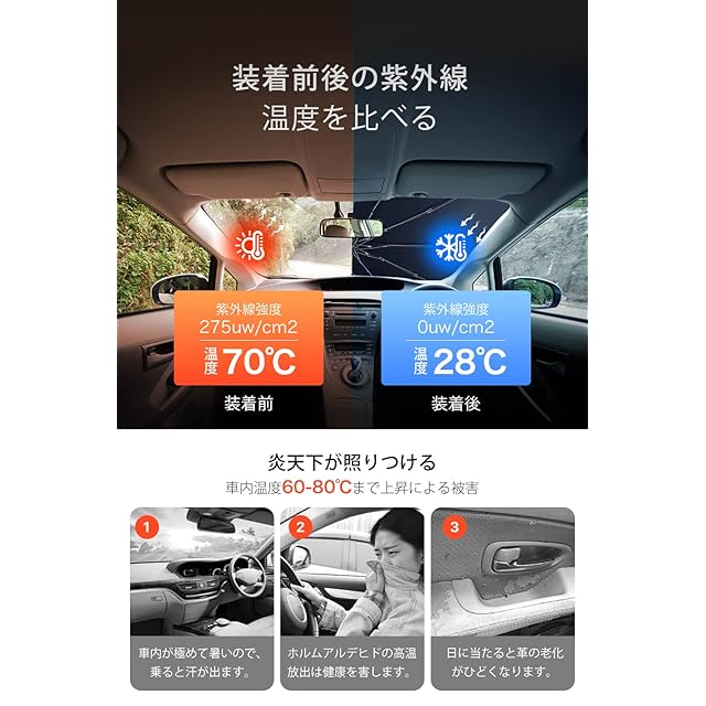 【自動車用 サンシェード 傘型】2023強化版車用サンシェードは傘型デザイン、フロントガラスを遮ます。夏の日差しがまっすぐに照りつけ、自動車内の温度が70℃以上に上昇し、日傘を使用することで、昇温を効果的に抑制し、気温を30°以下に維持することができます。新しいデザインが再びアップグレードされ、遮光遮熱の効果を強化し、UVを99.9%カットします。