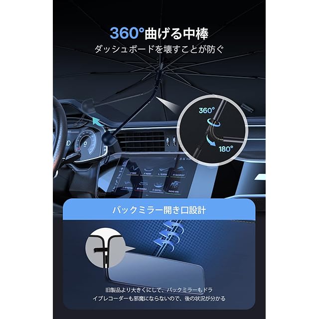 【曲がる中棒&バックミラー開き口】改良された中棒は手動で曲げることができ、ダッシュボードの上に置くことで、曲がる角度や向きはお好みで調整できます。バックミラー開き口は従来の製品より大きく設計されて、ミラー型ドラレコを装着しても使え、切り込みのある所をバックミラーにかけてとめると、サンシェードの位置を固定する同時にバックミラーも日差しからまもります。