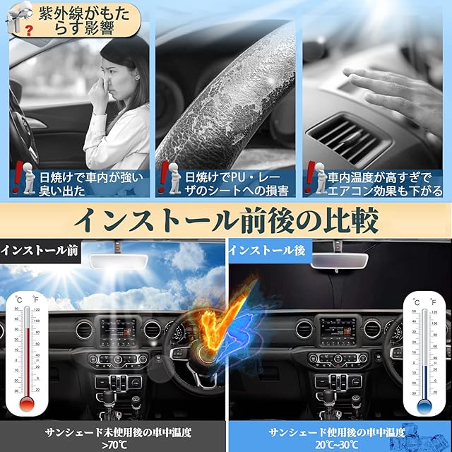【断熱・日よけ・内装劣化防止】この車用サンシェードはジープ ラングラー JL 2018+の車に適用します。この生地は日本製の効率的な複合チタン銀接着剤を採用し、99%の紫外線を効果的に遮断し、高品質のインパクトクロス+チタンシルバー接着剤を使用した。車用サンシェードは、熱を遮断して太陽光を反射し、車内の温度を効果的に下げ、ダメージや経年劣化を防ぎます。