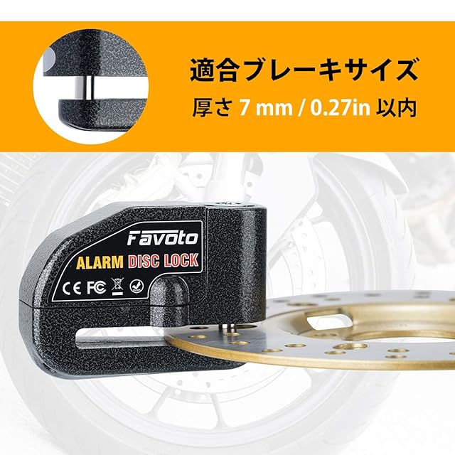Favoto バイクロック ディスクロック 大音量 110 dBアラーム 防犯ロック 7mmロックピン対応 盗難防止 防水 防塵 外し忘れ防止ワイヤー付き 収納ケース付き 黒色