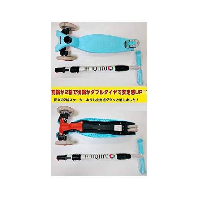 軽量で子供でも持ち運び楽々! ■安定設計:前輪が2輪,後輪が1輪の3輪構造で安定感を増加します、横倒れしにくい仕様になりました、ファイバーグラス加工されたデッキ部分、滑り止め機能が良い、デッキ面が広くて、より安全に安心して使用できます ■高さ調節で身長に合わせて使える! 商品の説明 ■タイプ: キッズ スクーター サイズ:58cmx23cmx90cm ■重量:約2.6kg ■対象年齢:3歳以上 ■耐荷重:50kg ■ブレーキ: 後輪ブレーキ ■ ウィール: 三輪、PU素材。■ウィール:前輪12cm、後輪8cm ■.ポイント:後輪ブレーキ(安全を支えるのは後輪の役目) ■ハンドルの高さ調整が可能。高さ67cmから90cmまで4段階調整可能:約67cm、約80cm、約85cm約90cm(3歳-15歳の子供に向け) ■.ステップ部分の素材がファイバーグラスです。デッキ面が滑り止め加工を施したことで、安心で快適な滑りをサポートします。 ■ 回るとキラキラ光るホイールを使用します。薄暗くなった夕方でも目立つから、視界に入りやすく安全です。 使用上の注意事項○ ※仕様は改善の為に予告なく変更する場合があります。 ※ディスプレイ画面等の環境上、写真と実際の商品の色とは多少違う場合がございます。 ※海外輸入商品により、汚れ/ダメージ等がついている場合がございます。 ○以上を了承の上ご購入ください○