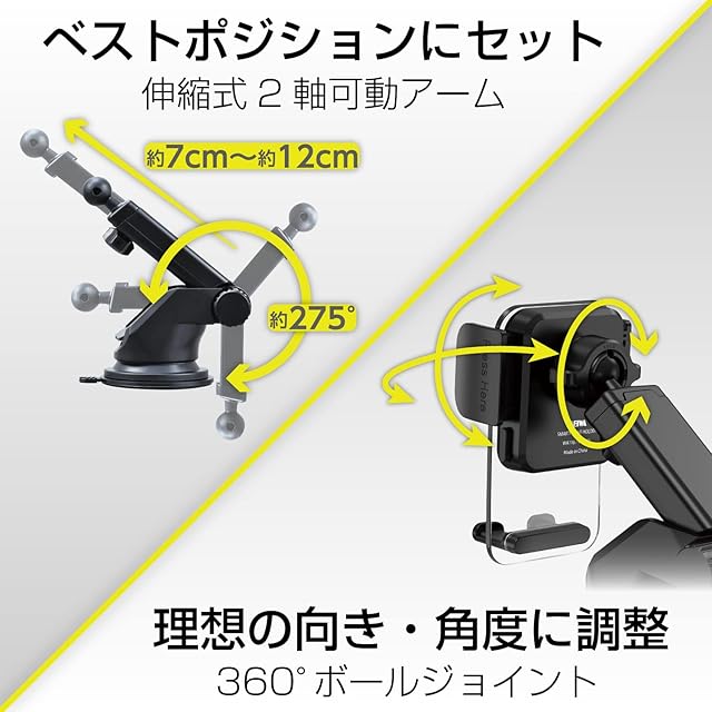 ダッシュボード(吸盤)取り付けタイプ。伸縮式アームで奥行き・角度が調節可能です。
